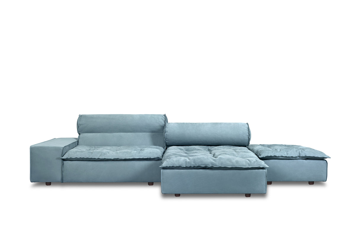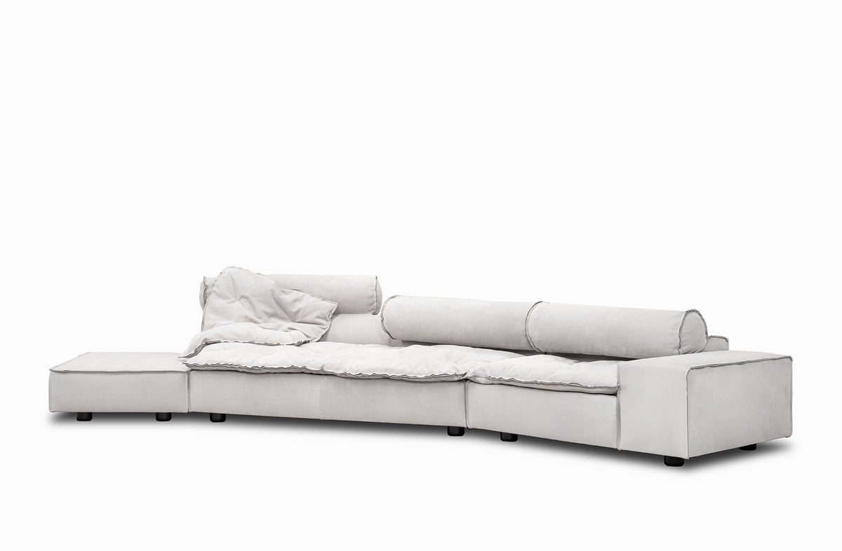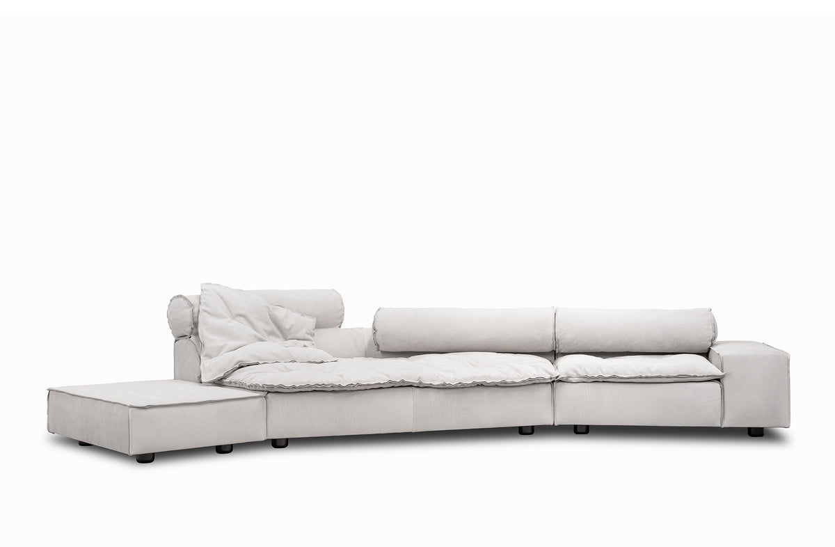 Miami Soft, in the delicacy given by the velvety hand of the upholstery, finished with raw thread stitching, and the ductile flexibility of the elements with which it can be completed - the cushions in several sizes and the bolster pillows, one independent and the others on the backrest - recalls that idea of interior management photographed in the design magazines of the 1950s and 1960s.