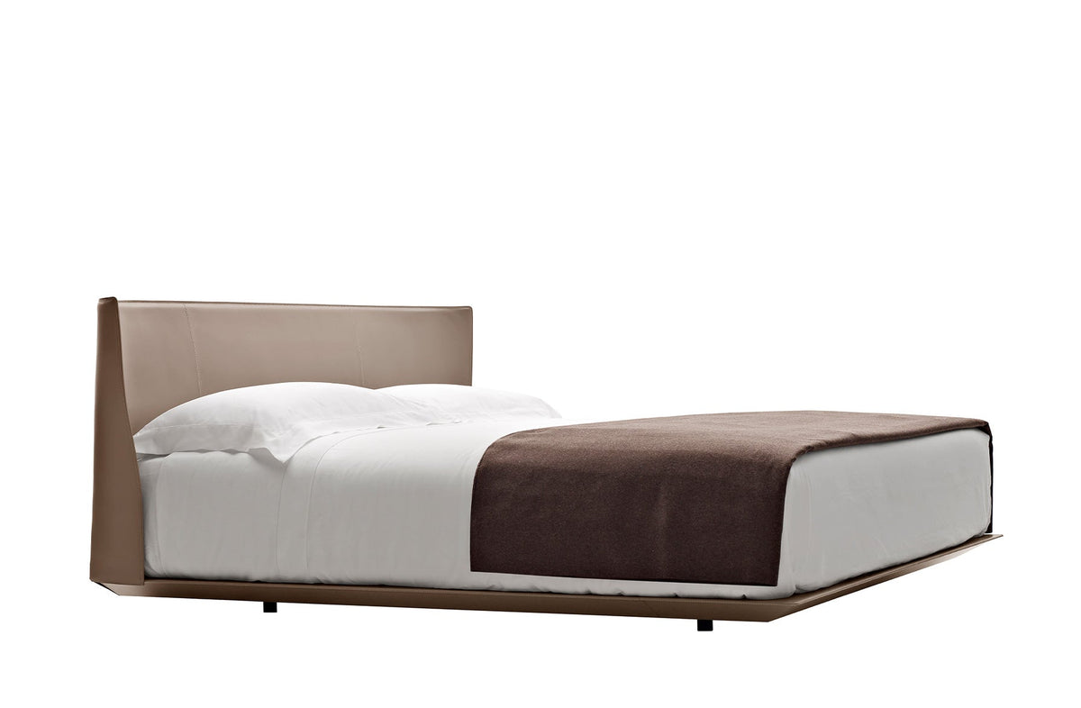 A sheet of leather “pinched” in two places at the base: here is where the movement and natural inclination of the Alys headboard originate. The Buratti brothers are once again managing a material that they know well because they’ve already used it on the Doyl chair when they explored the theme of upholstered leather, made more comfortable than with traditional processes. For Alys, they designed a comfortable, protective headboard, a very effective shape that has thin perimeter strips marked by a lengthwise seam. The bed frame can be placed at two different heights, thanks to a standard equipment made of two sets of feet (h. 5cm or 15cm). The bed surface was designed to be low specifically to suggest an effect of suspension and floating of the super-comfortable mattress.