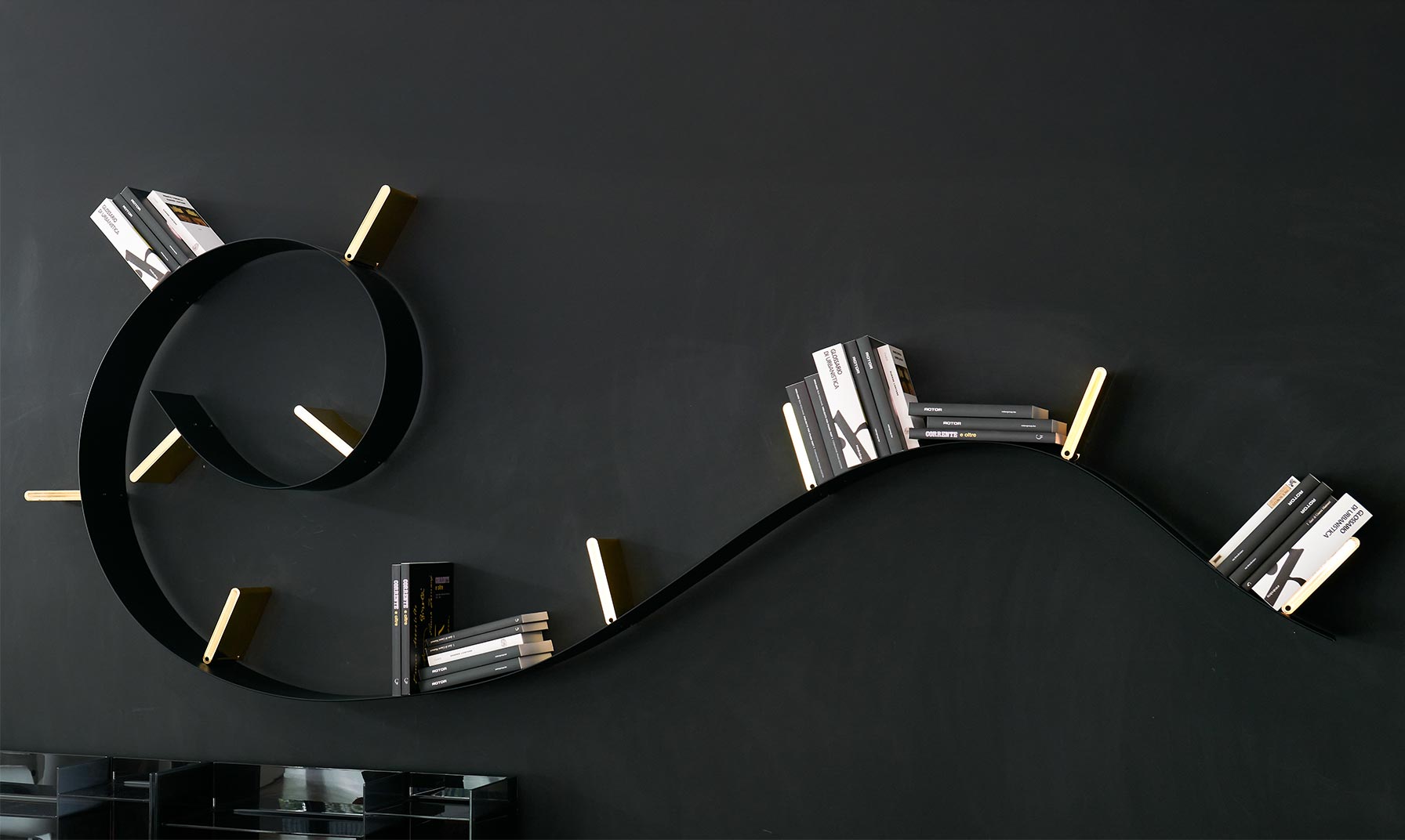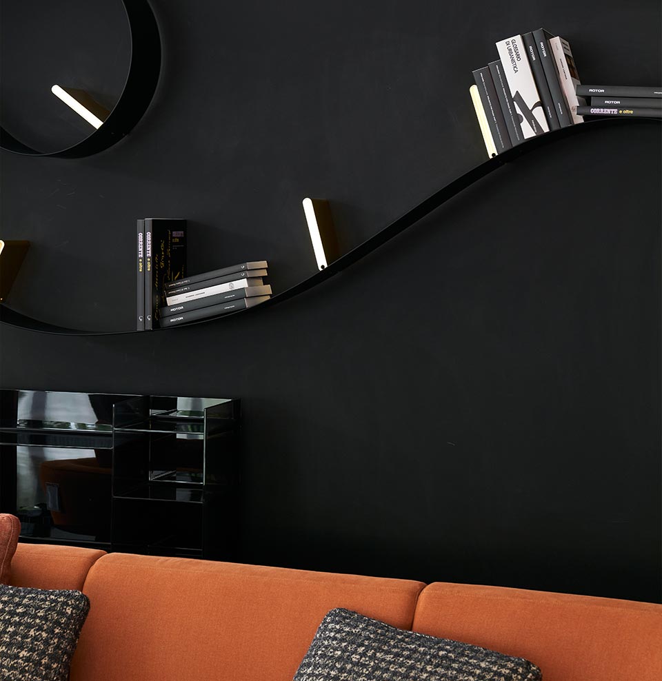 Bookworm, the flexible bookcase, is the result of the encounter between the creativity of an artist such as Ron Arad, combined with Kartell's technology, giving life to a revolutionary project produced on an industrial scale. A sinuous bookcase that takes on the desired shape without compromising strength and functionality. Available in three different lengths, Bookworm is marked by a series of bookend supports. Bookworm combines flexibility and high strength allowing a load of about 10 kg per support.