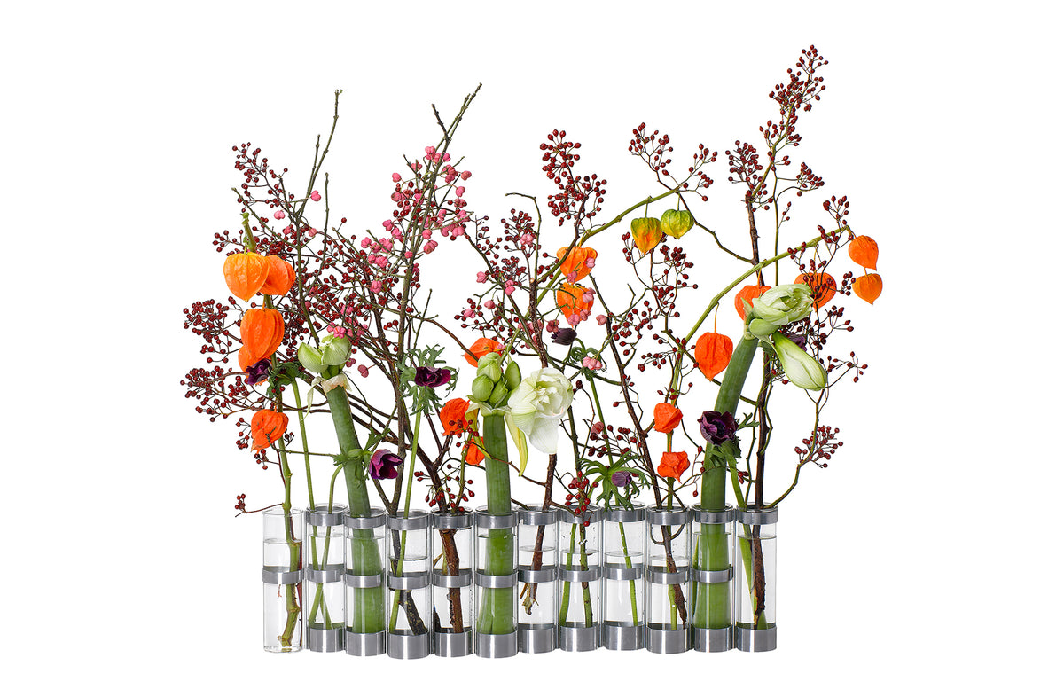 12 Blown glass tubes fitted into zinc coated metal frame. You can arrange the components into various shapes and forms. From this starting point, you are able to rearrange the vase into diverse positions. As a contrast in forms, after removing one of the tubes from the chain, the two tail-ends can be joined to create a ring. The tubes may be independently detached from the suite in order to create autonomous segments. In this fashion, the vase can be shortened; or, by easily attaching two or more vases together, any extended length can be achieved. After using it in water, the metal gets oxidised: a "white rust" will appear. It comes with a handy spare glass tube. Extra tubes available separetely.