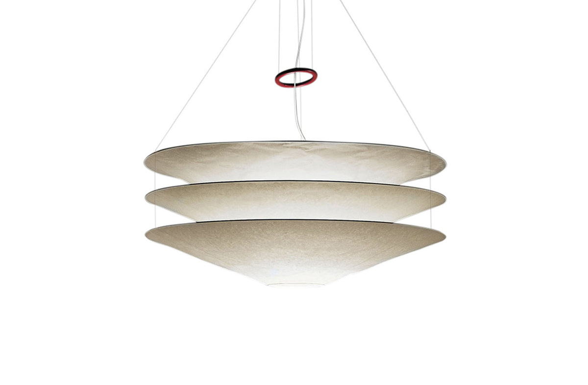 Japanese paper, metal. Height adjustable with red-enamelled iron ring. Metal canopy, white finish.