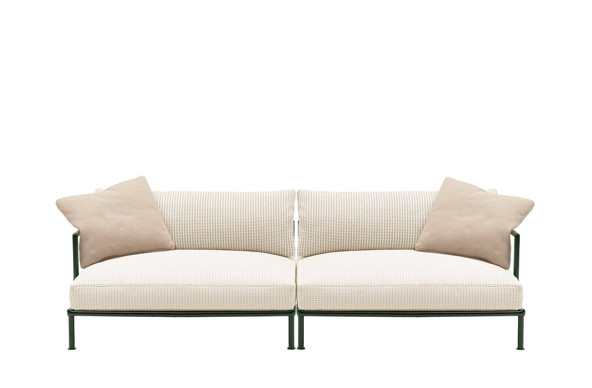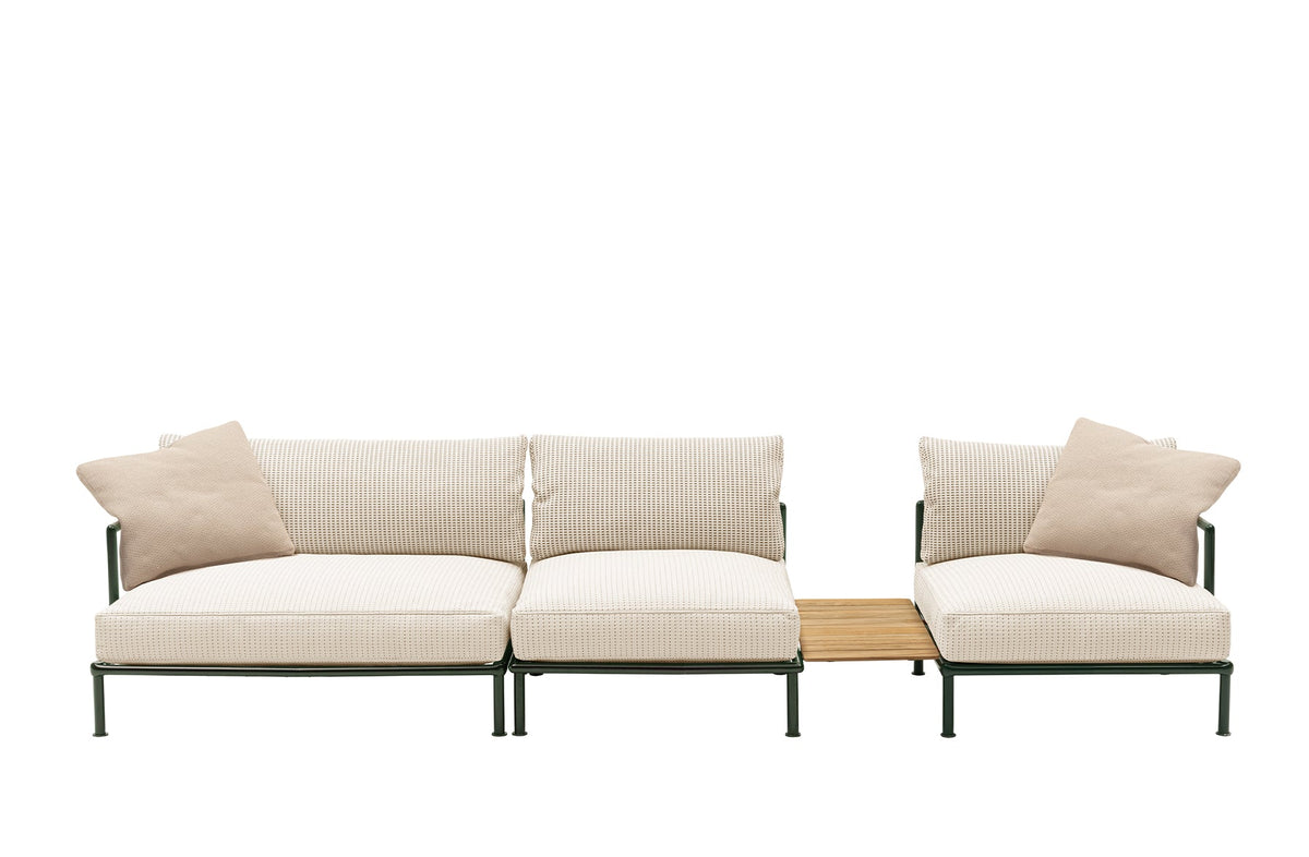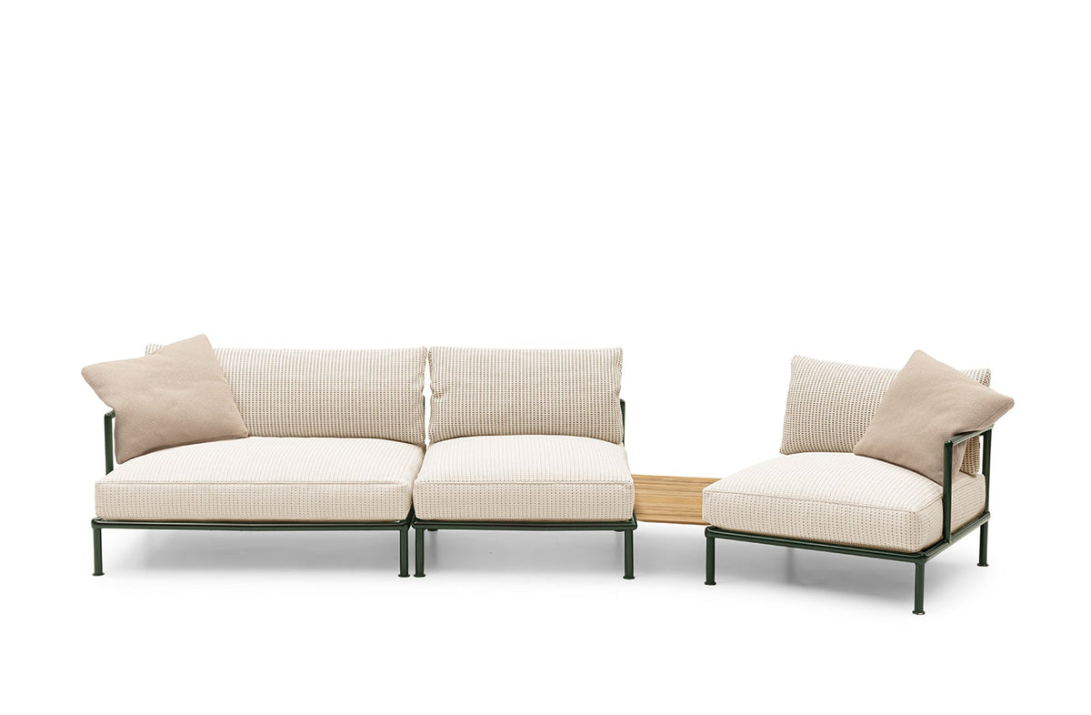 After the great success of Borea, Piero Lissoni and B&B Italia continue to pursue research and sustainability in the outdoor sector, creating Nooch, a modular seating system whose name is inspired by the tropical botanical garden of Nong Nooch in Thailand. Its key feature is the tubular structure in recycled aluminium, a light and strong material, completely recyclable. A choice inspired by simplicity, which recalls elementary tubular structures and ennobles them with a design that pays attention to every detail. The intersection of the structural elements represents the iconic feature of this collection, with the particular elbow curve achieved by the way the aluminium bends. A design and engineering detail that combines function and beauty. Nooch is a system that offers the possibility of creating infinite combinations from two base modules: a rectangular one and a square one. Both can be equipped with backrests and armrests and have an aluminium top with slats on which the cushions rest. The modules can be arranged as free-standing units or attached firmly together by means of special interlocking joints so as to create a variety of configurations. A series of additional top sections, to be inserted between the elements, offers even greater compositional freedom. The paddings are designed with sustainability in mind. They use regenerated materials, which are completely separable, and consist of two layers of polyurethane with different densities and firmness: one layer made of polyurethane recycled from production waste and one made of virgin bio-polyurethane, both wrapped in an outer sheath of recycled PET. The system is completed by a small round service element to be inserted between the cushions to offer further support and a particular backrest/armrest cushion to be inserted between the elements to create inverted and double-sided seats.