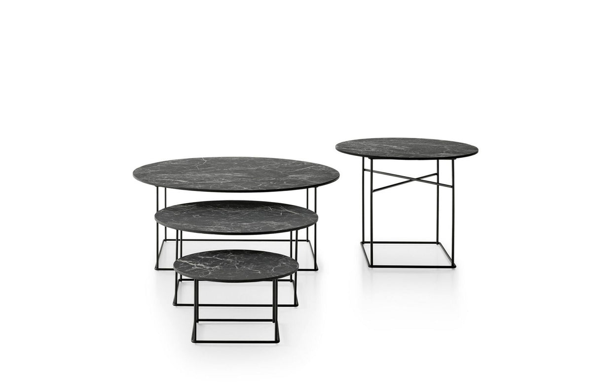 Round with a light steel rod frame, and available in different sizes and heights, the Fat-Fat Outdoor small tables come in two versions: the first has a steel tray top painted to match the frame; the second has a marble-effect porcelain stoneware top in two finishes.
