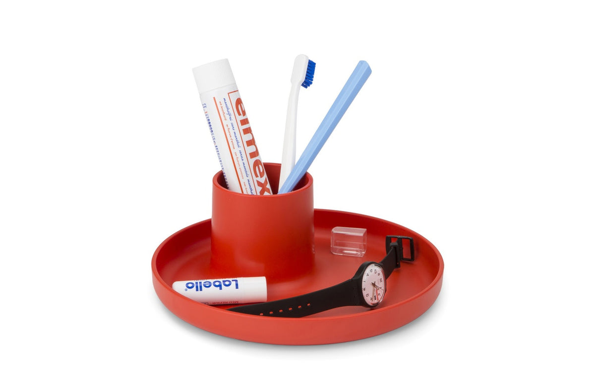 O-Tidy is a useful, versatile storage container perfectly at home on desks, kitchen worktops or sideboards. The design not only offers a tray and cup function but also combines their simple shapes into a new, perfectly proportioned object.