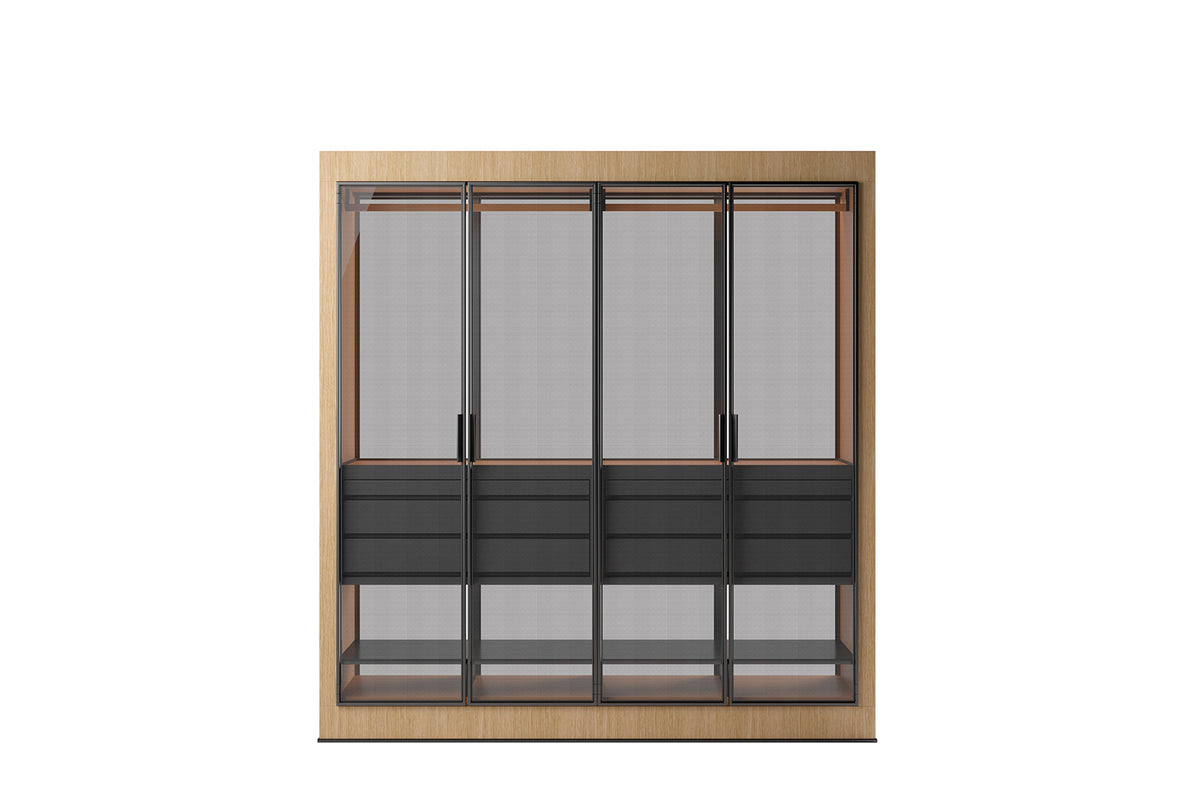 The Eracle series extends from the living room to the bedroom with an unusual storage unit of strictly calibrated proportions, very easy to use. The new volume, also in double-sided version, has the same characteristics defining the storage units for the living room: volumes, doors and back panels with coupled transparent glass (with high-tech internal fabric) and bronzed nickel edges.