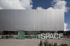 Modern building with a large 'SPACE' sign at night