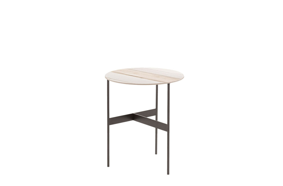 Lightness and simplicity distinguish Formiche (Ants in English) complements. The slender support FRAME (making reference to the name), with its shape and finish, picks up the theme of the feet in the sofa system. The rounded support of pewter painted steel is connected by crosspiece to support the tops in different shapes, round, oval, or “kidney bean.” Various shapes and heights make it possible to compose different support systems. The tops themselves, made of transparent extra light glass, brushed light oak, titanium finish metal, or porcelain stoneware, Calacatta white or stone grey stone, have a fine thickness of 8 mm.