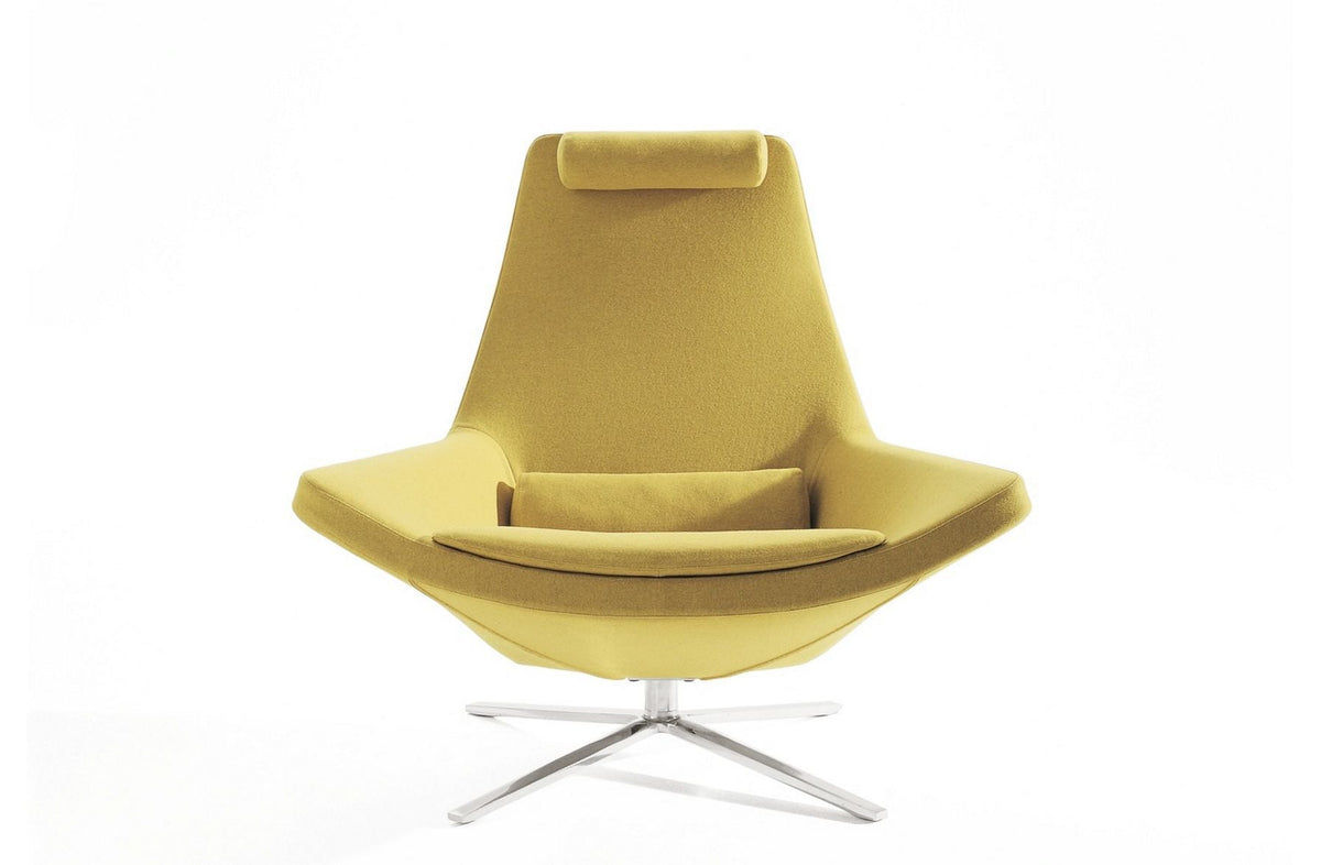 The seat that flows uninterruptedly into the armrests is the hallmark of this small armchair and relaxation chair. The former, with aluminium swivel base and four spokes, combines elegance and comfort. The latter, which is also swivel and has a matching ottoman, is larger with a headrest with magnet for adjustments. There are two bases available, one with four spokes and one circular, both in bright brushed aluminium.