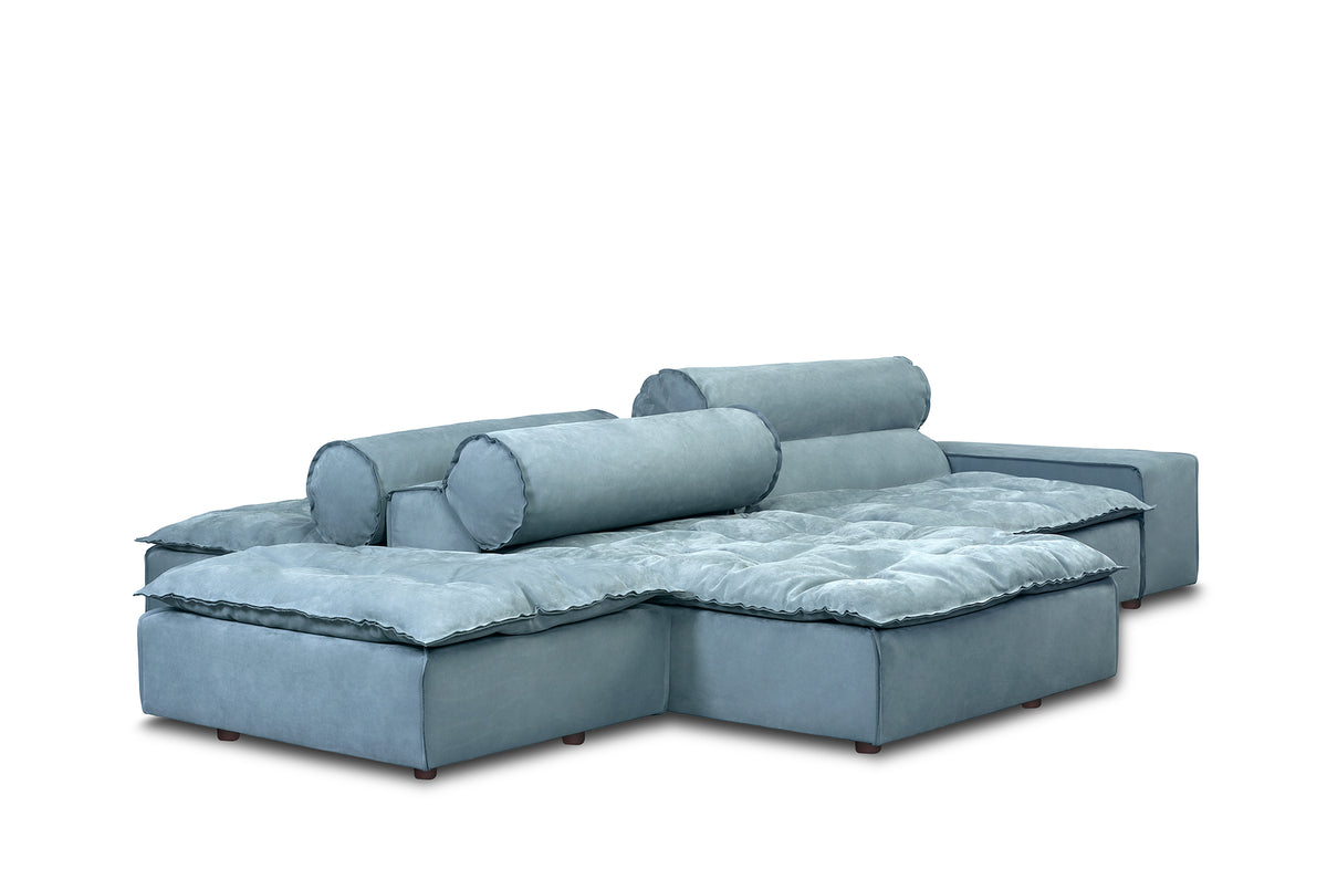 Miami Soft, in the delicacy given by the velvety hand of the upholstery, finished with raw thread stitching, and the ductile flexibility of the elements with which it can be completed - the cushions in several sizes and the bolster pillows, one independent and the others on the backrest - recalls that idea of interior management photographed in the design magazines of the 1950s and 1960s.