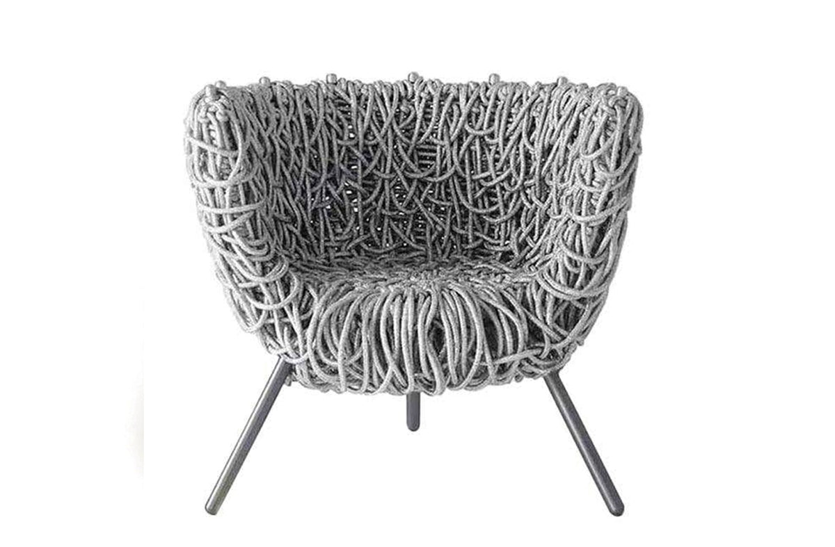 Wrap-around armchair with steel frame. Innovative chair, created by the overlapping of hundreds of twists of about five hundred meters of special rope with acrylic core, on the base frame.