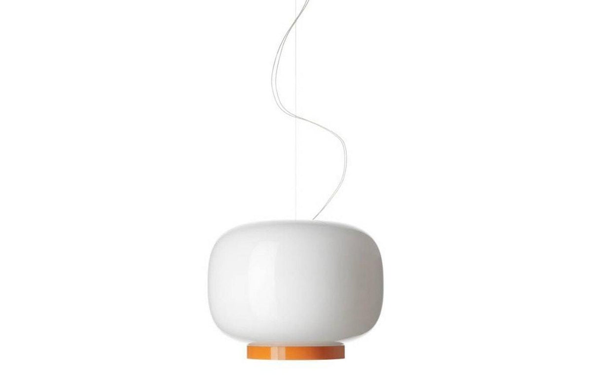 A poetic and decorative model, Chouchin reverse 1 stands out for the slim lower collar in warm orange, which completes the white blown glass diffuser with originality, generating a sunny and diffused light into its surroundings.