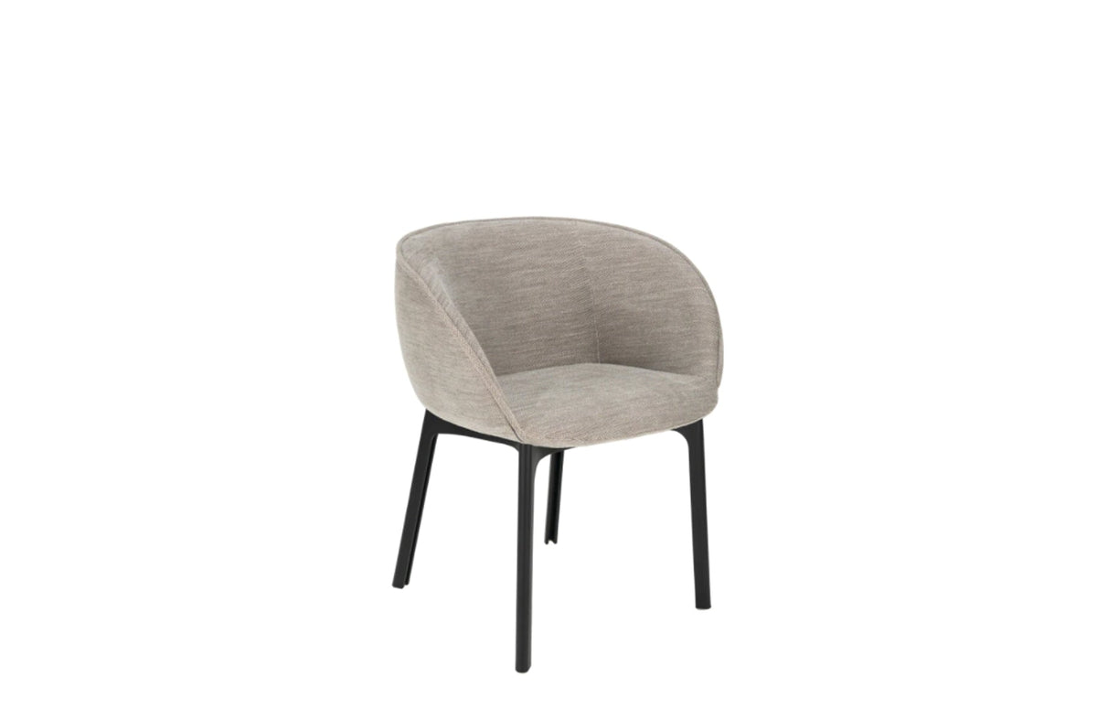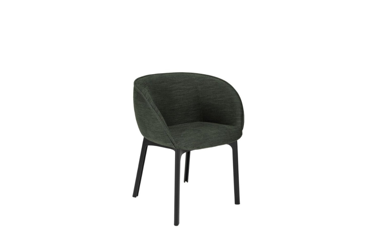The CHARLA dining armchair boasts elegant, flowing lines and embraces you in an almost wrap-around seat. The chair has everything needed for the contract and consumer segments and is perfect for a quick rest in a hotel lobby or a TV dinner in the lounge at home. Charla combines elegance with sustainability thanks to legs made from recycled plastic. The frame comes in black, with upholstery in bouclé fabric or a special mélange fabric for the contract market.