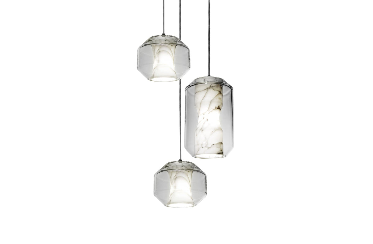 This Chamber Chandelier is a stunning lighting centrepiece featuring one Large, and two Small Chambers hung at various lengths to create a luxurious installation. Housing a sculptural Carrara marble diffuser within a lead crystal vessel, Chamber expresses the unexpected translucent qualities of marble in a compelling decorative pendant.