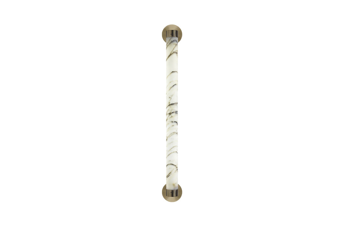 Skillfully milled from a single piece of Carrara marble and finished at each end with brass or chrome bands, Tube contains a strip of LED bulbs resulting in what appears to be a solid length of warm glowing stone. The unique veins of each piece of marble mean no two lights are exactly the same. A handcrafted twist on the traditional fluorescent tubelight.