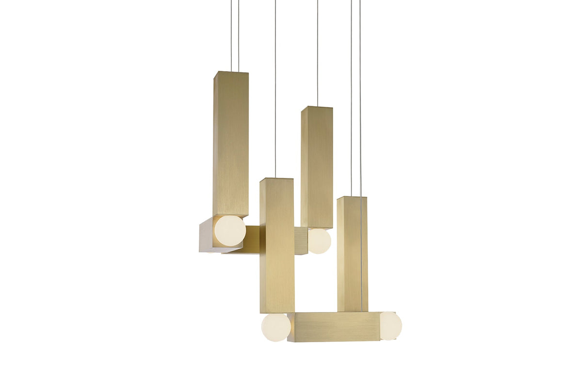 Vesper is inspired by the simple geometric lines of Brutalist sculpture and modernist cathedral lighting. Formed with extruded aluminium and available in anodized gold or silver, Vesper explores the delicate balance and interconnection of its rectangular cubes that are seamlessly connected by illuminated spheres.