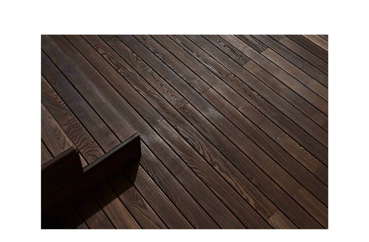 The wood materials from the outdoor collection boast an organic durability of 25 years. The flooring elements made from Fontaines Ash Wood, Accoya® and Scotch Pine are made from certified raw materials from sustainably managed forests.