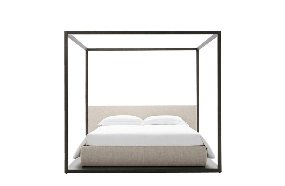 The classical canopy bed in a modern interpretation, suitable to be positioned mid-room; bed sides and headboard in leather or fabric. The bed rests on a platform which is large enough to position a service element with an open compartment at the foot of the bed.