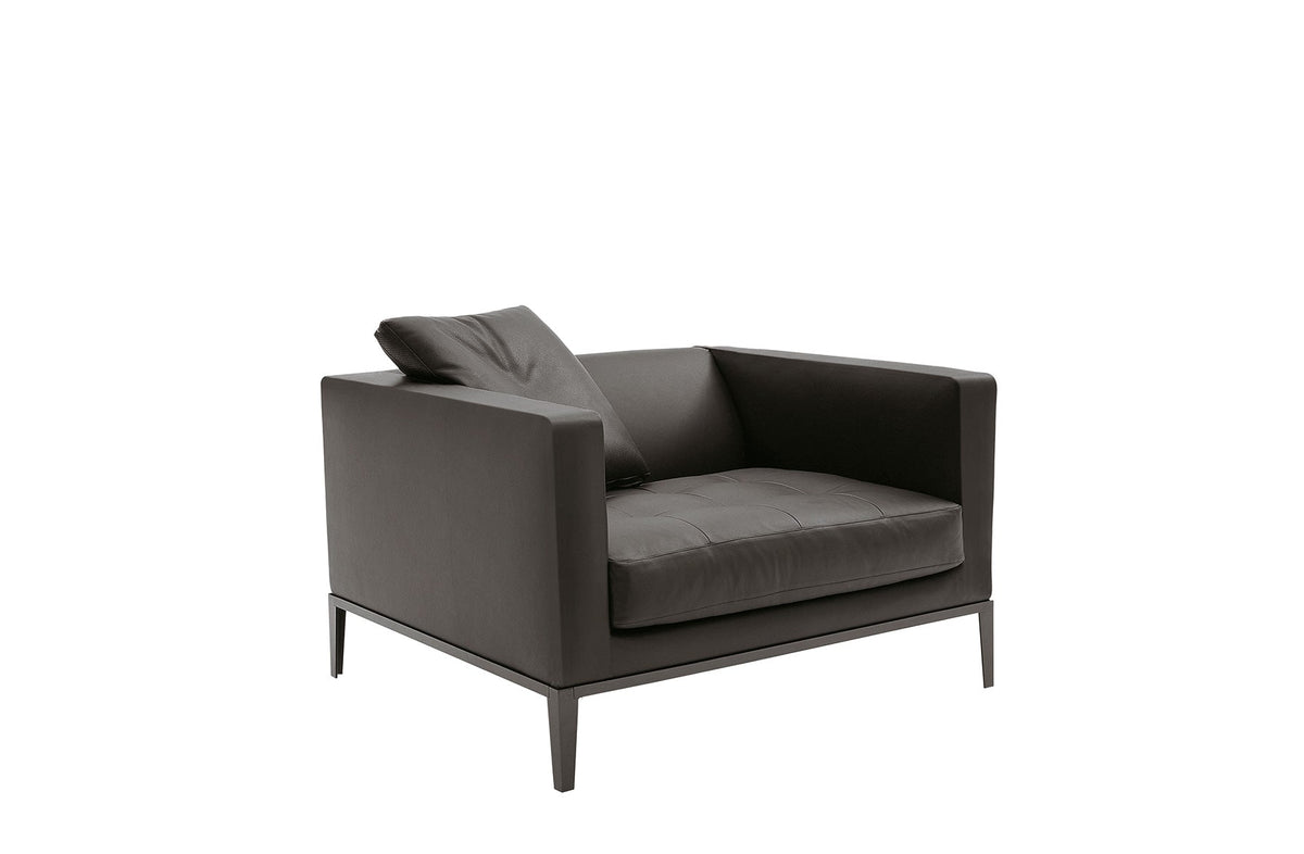 The same features as the Simplex, the topstitched one-piece seat cushion and the feet in bronzed nickel painted aluminium, but with thinner armrests creating a lighter aesthetic. Sofa, armchair and ottoman are also proposed with a slip cover for a younger and more feminine touch.