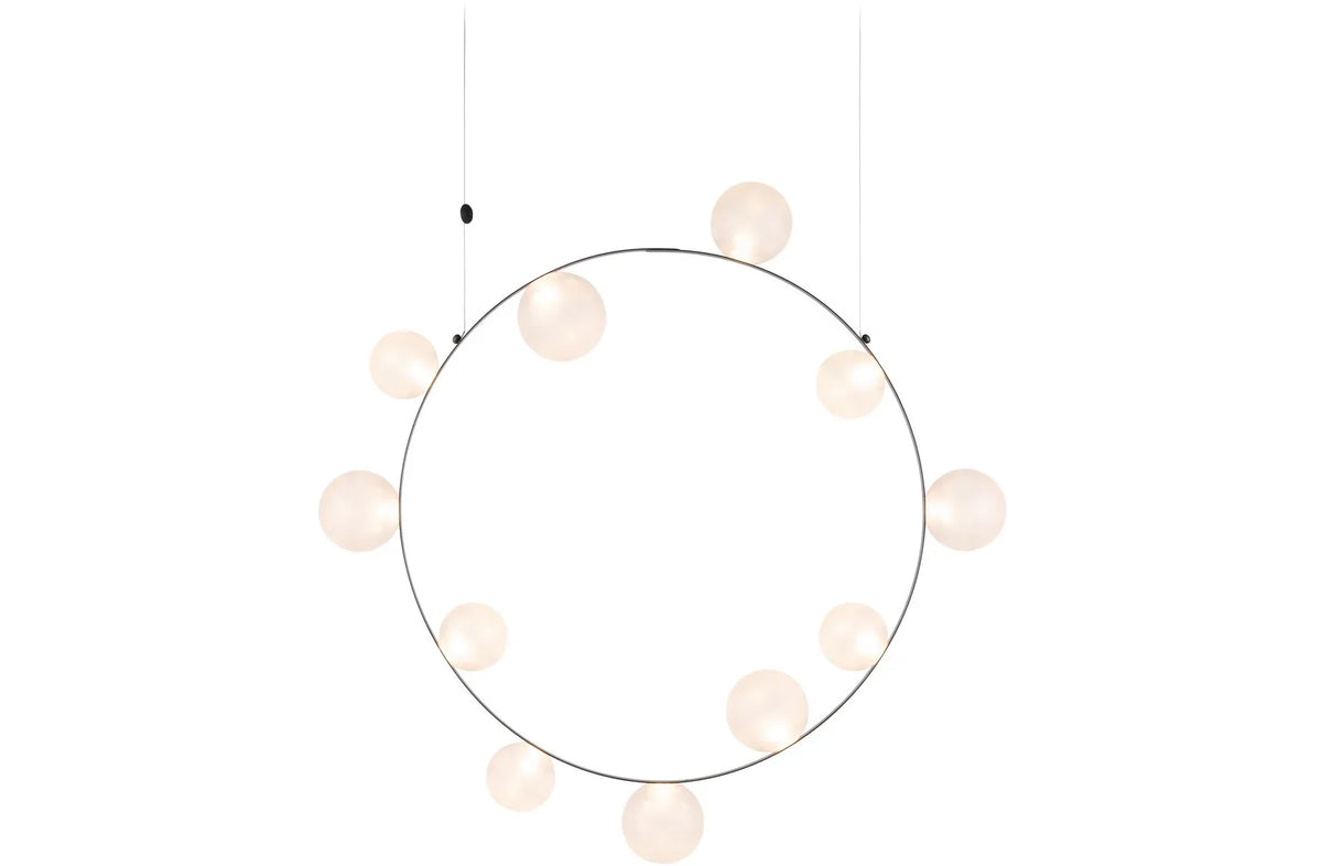 Hubble Bubble, designed by Marcel Wanders, is an airy and joyful suspension lamp. Either 7 or 11 glass LED bubbles, available in oil-iridescent and frosted versions, are stuck on a circular metal frame. Hubble Bubble can be hung both horizontally and vertically and is powered through Electrosandwich® by Marcel Wanders. Hubble Bubble is a perfect statement piece, that for example could perform above a table in an atrium.